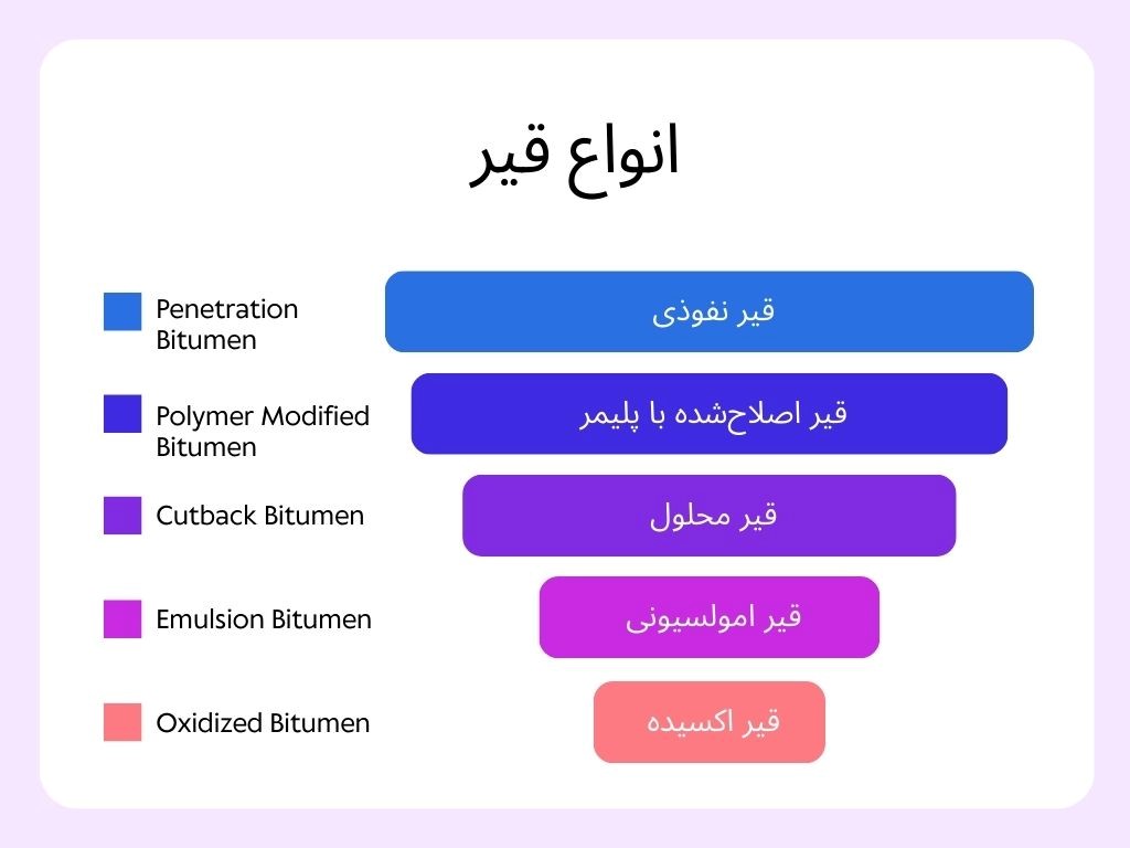 قیر مادهای چسبناک، سیاه و بسیار ویسکوز است که از نفت خام به دست میآید. این ماده به طور گسترده در صنعت راه و ساختمان برای کاربردهایی مانند ساخت جاده، عایقبندی، سقفسازی و موارد دیگر استفاده میشود. قیر در انواع و درجهبندیهای مختلفی موجود است که هر یک دارای ویژگیها و خصوصیات منحصربهفردی هستند و برای کاربردهای خاص مناسباند. در ادامه به معرفی انواع قیر و کاربردهای آنها میپردازیم: